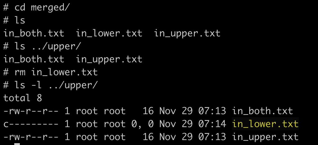 第二种是删除文件,如果我们删除”in_upper.txt”,那么这个文件会在upper/目录中消失。如果删除”in_lower.txt”, 在 lower/目录里的”in_lower.txt”文件不会有变化,只是在 upper/目录中增加了一个特殊文件来告诉OverlayFS,”in_lower.txt’这个文件不能出现在merged/里了,这就表示它已经被删除了。