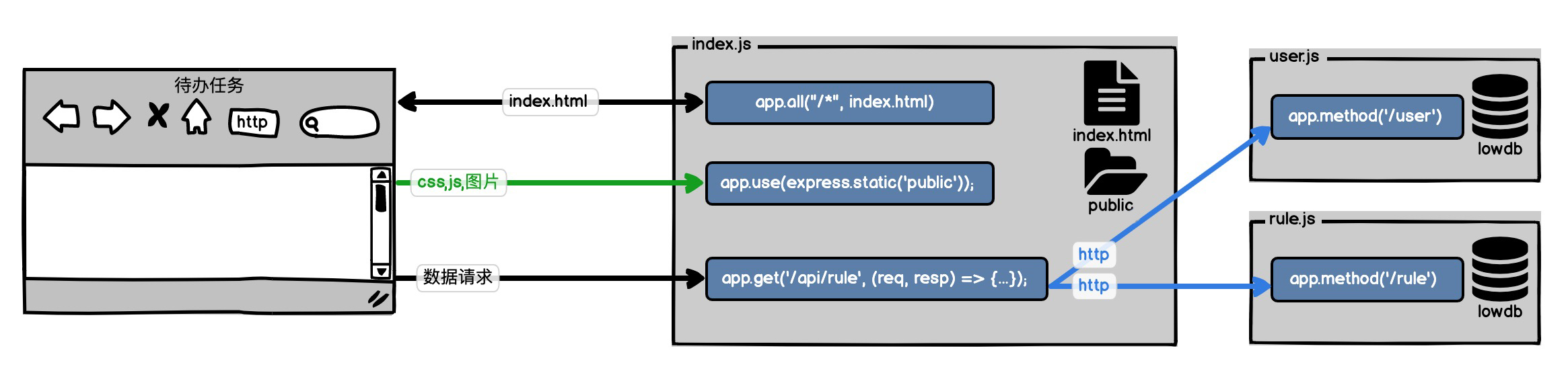 API的数据处理,主要有两个,一个是/api/rule处理待办任务的,一个是/api/user负责用户登录态,而且我们“待办任务”主要的数据模型也就是待办任务和用户这两个。那我们可以将后端拆分出两个微服务:待办任务微服务和用户微服务。这里我要强调下,我只是为了向你演示微服务才这样做,在实际业务中,这么简单的功能,没必要过早地拆分。