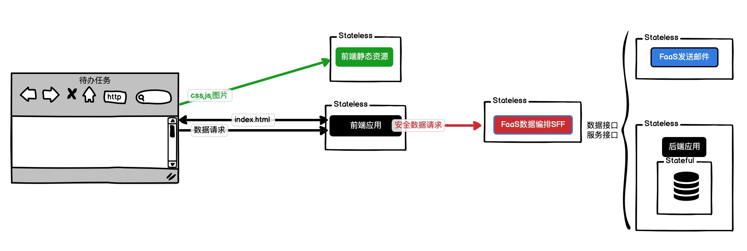 我们先回忆一下上节课的“待办任务”Web应用,这个项目前端是单页应用,中间用了FaaS做SFF数据网关,后端数据接口还要BaaS化。这个案例会贯穿我们的课程,所以你一定要动手run一下。为了让你对我们的项目有个宏观上的认识,我还是先交付你一张大图。