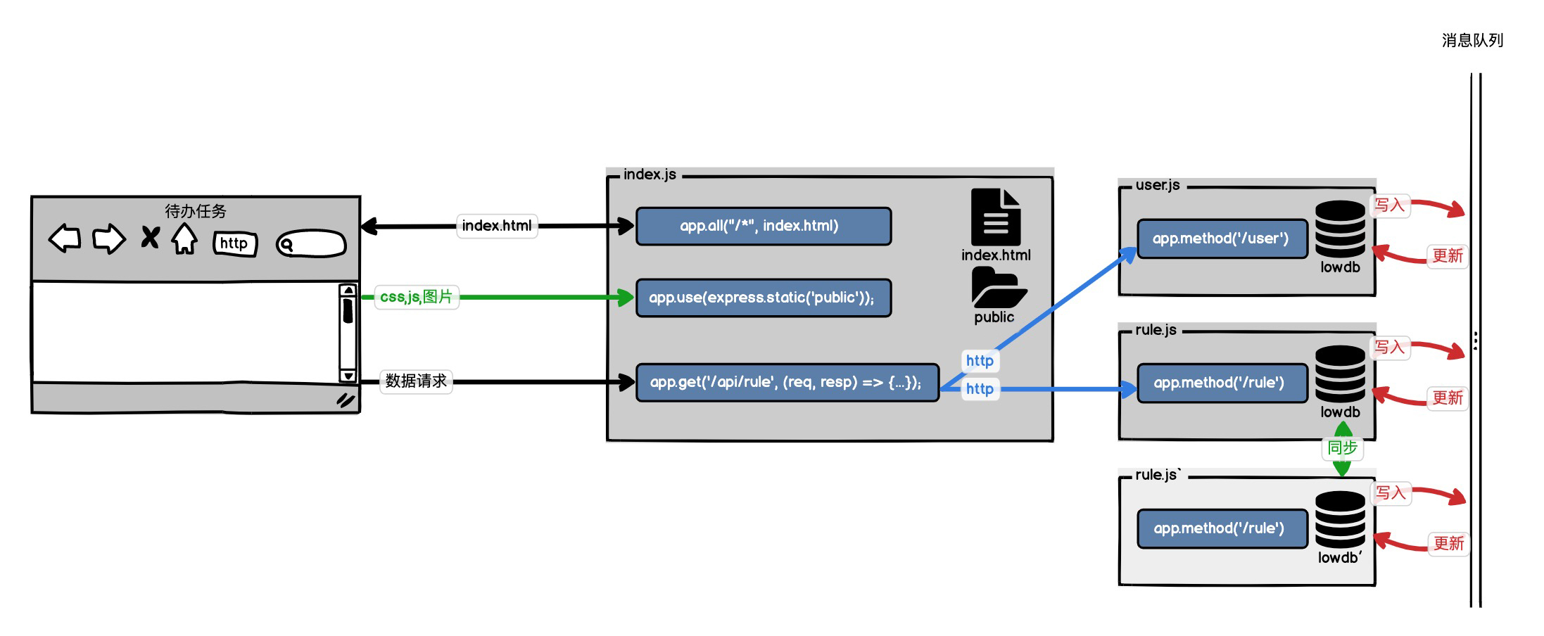 初步拆解,我们将index.js中的数据库移走了,而且拆分后各微服务的数据库比原来混杂在一起简单且容易维护多了。user.js负责用户相关业务逻辑,只维护用户信息的数据库,并且暴露RESTful的HTTP方法;rule.js负责待办任务的增删改查,只维护待办任务的数据库,并且暴露RESTful的HTTP方法;index.js只需要负责将请求HTTP返回给数据编排。