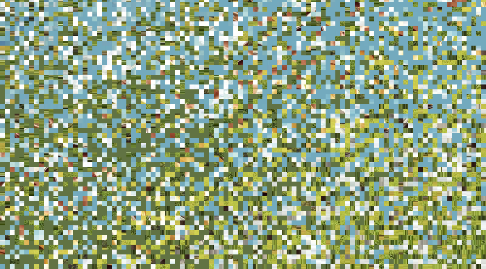 然后,我们再用伪随机函数random 根据网格随机一个偏移量,因为这个偏移量是01之间的值,我们将它乘以2再用1减去它,就能得到一个范围在-11之间的随机偏移。这样我们从纹理取色的时候,不是直接从对应的纹理坐标vUv处取色,而是从这个随机偏移的位置取色,就能保证取出来的颜色就是一个乱序的色值。这时候,图片显示的效果是一片随机的画面: