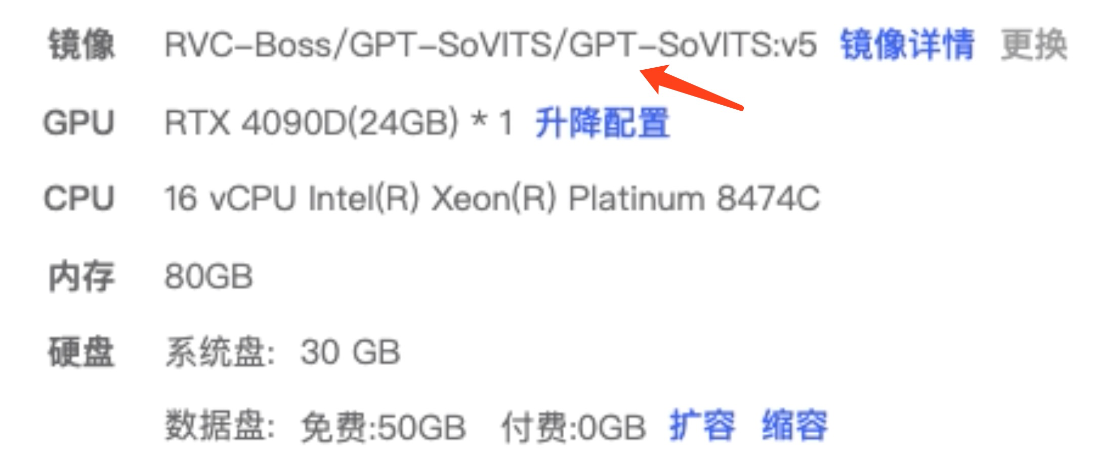 我选用的是AutoDL云计算环境。注意选用一个GPT-SoVITS的镜像创建主机,下面是我具体的主机配置。