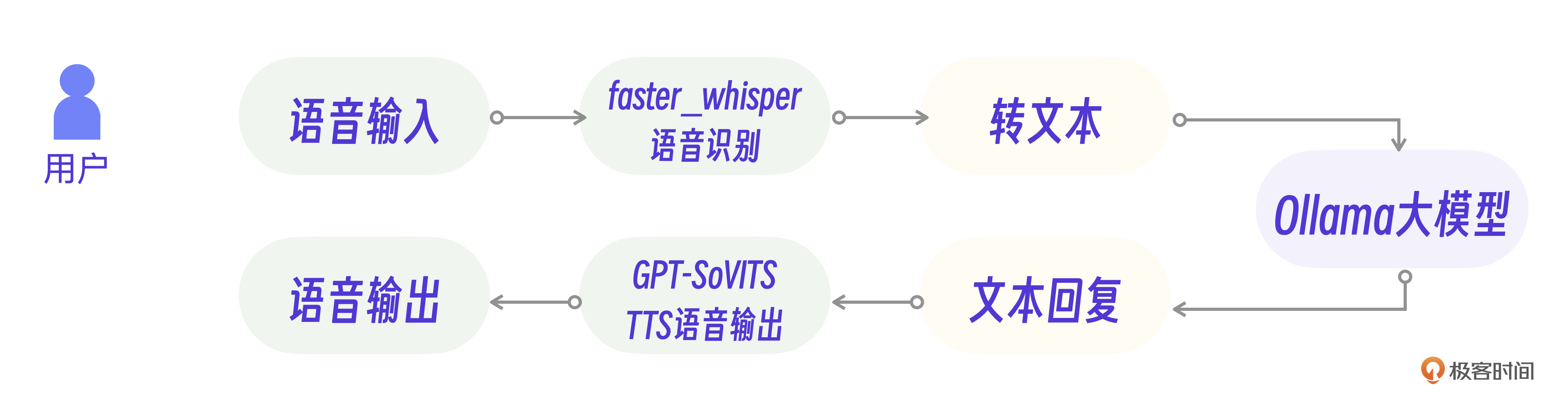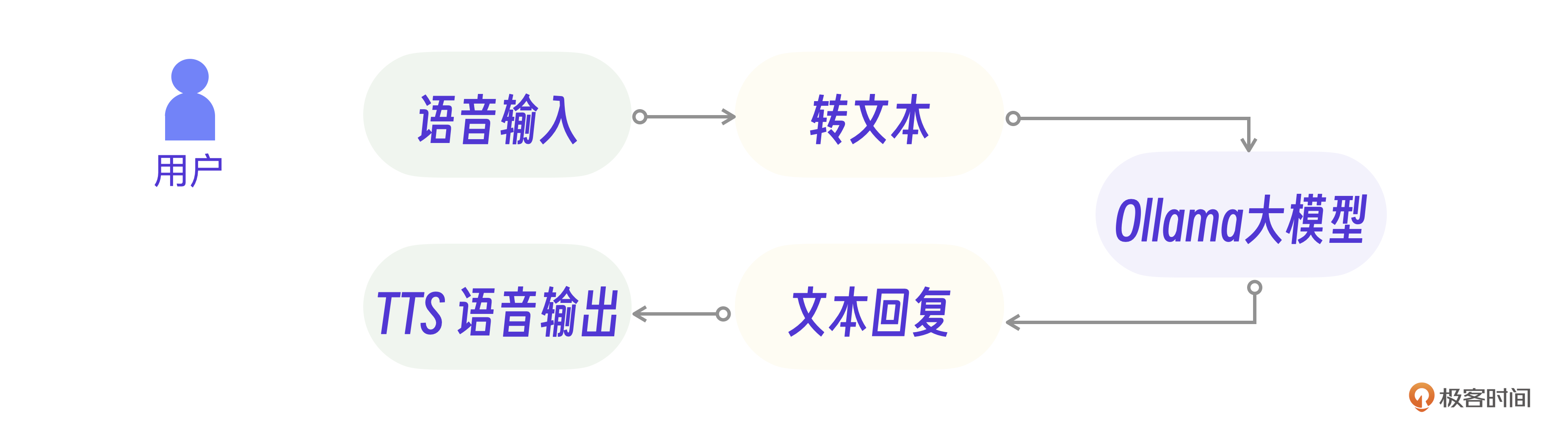 克隆之后,我们还要实现一个极客时间的语音助理。这个语音助理的内核其实还是之前的Ollama文本大模型聊天能力,只是需要在文本聊天的基础上加入语音的输入和输出能力。