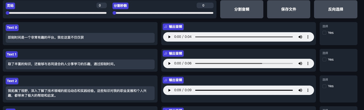 第一步,将这个录制语音提取出纯人声的音频,再进行分割,按一定秒数分割成语音文件,最后对语音做文本识别。这个过程的目的就是生成文本-语音的序列数据,为下一步的微调做数据准备。