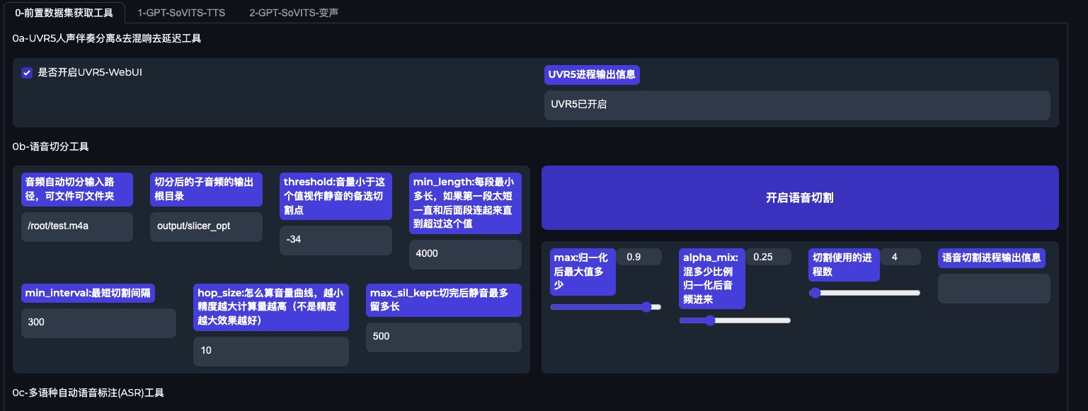 AutoDL云计算的成本大约在2元/小时左右,整个训练过程我花了不到10元,还是非常经济的,购买了主机之后,可以进入GPT-SoVITS的界面,所有的后续训练操作都在这个界面上完成。