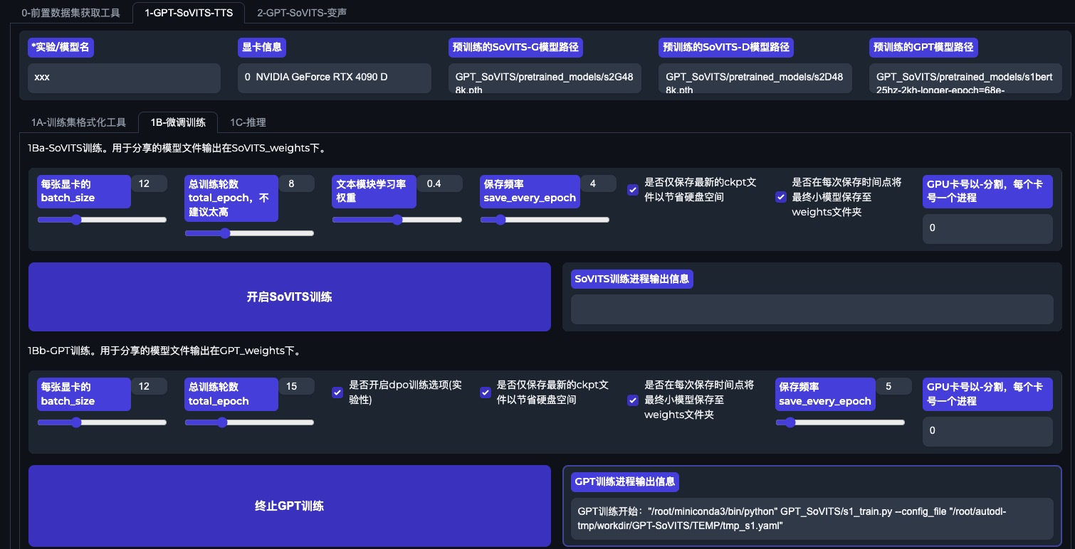 第二步,在刚才准备的文本和语音数据基础上,微调GPT-SoVITS训练自己的TTS模型。这里你可以自由发挥,直接在界面上操作,过程比我想象得要快很多,大概不到10分钟。