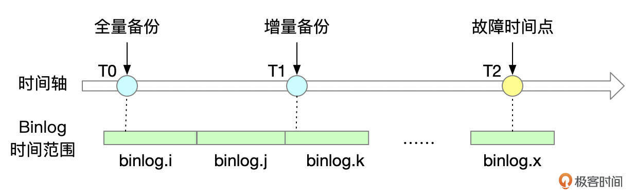 看上面这个图,如果在T2时间点发生了数据丢失故障,就可以找一个在T2时间之前完成的全量备份。假设在时间点T0有一个全量备份,T1有一个增量备份,就可以先恢复全量备份和增量备份,然后再应用T1到T2之间的Binlog。如果没有增量备份,也可以恢复全量备份后,应用T0到T2之间的Binlog。这样都能将数据恢复到发生故障前的那个时间点。