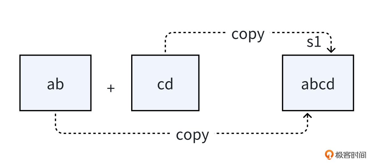 比如字符串“ab” 和 字符串“cd” 要拼接,就得先给结果字符串找个地方,然后把字符串“ab” 和 “cd” 分别拷贝过去,这样就得到了新的字符串。