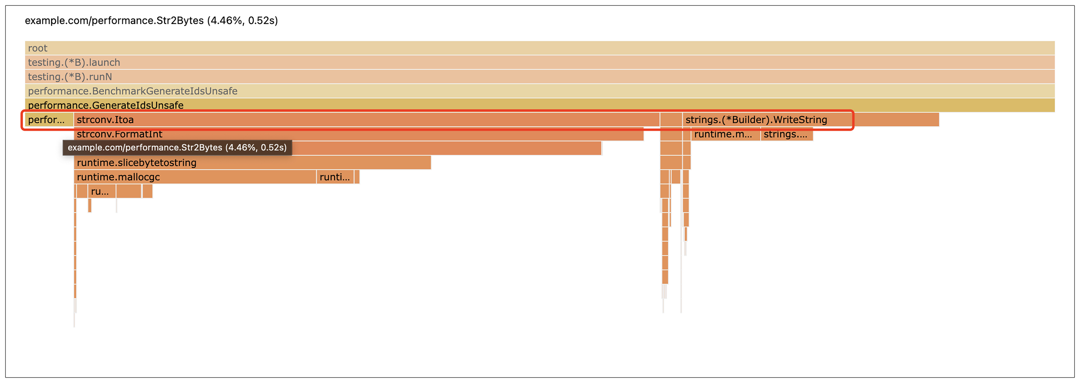 从火焰图上可以看出,经过前面几次的优化,我们的函数最耗时的操作就只剩下已经优化过之后的字符串转字节切片、整型转字符串和字符串拼接这3个操作,因此没有进一步优化的空间了。