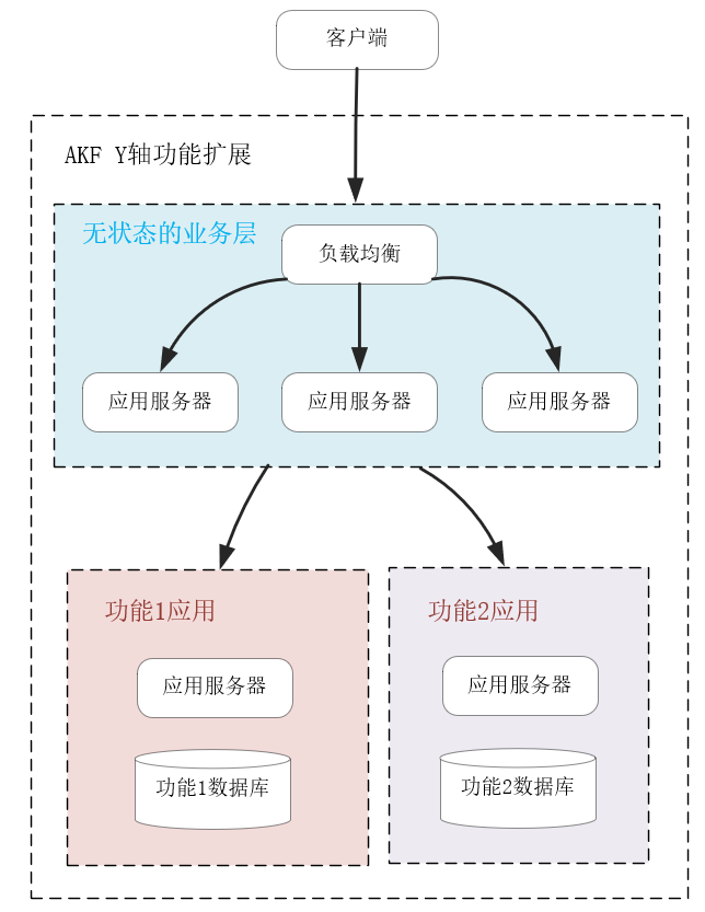 当然,AKF X轴扩展最大的问题是只能扩展无状态服务,当有状态的数据库出现性能瓶颈时,X轴是无能为力的。例如,当用户数据量持续增长,关系数据库中的表就会达到百万、千万行数据,SQL语句会越来越慢,这时可以沿着AKF Z轴去分库分表提升性能。又比如,当请求用户频率越来越高,那么可以把单实例数据库扩展为主备多实例,沿Y轴把读写功能分离提升性能。下面我们先来看AKF Y轴如何扩展系统。