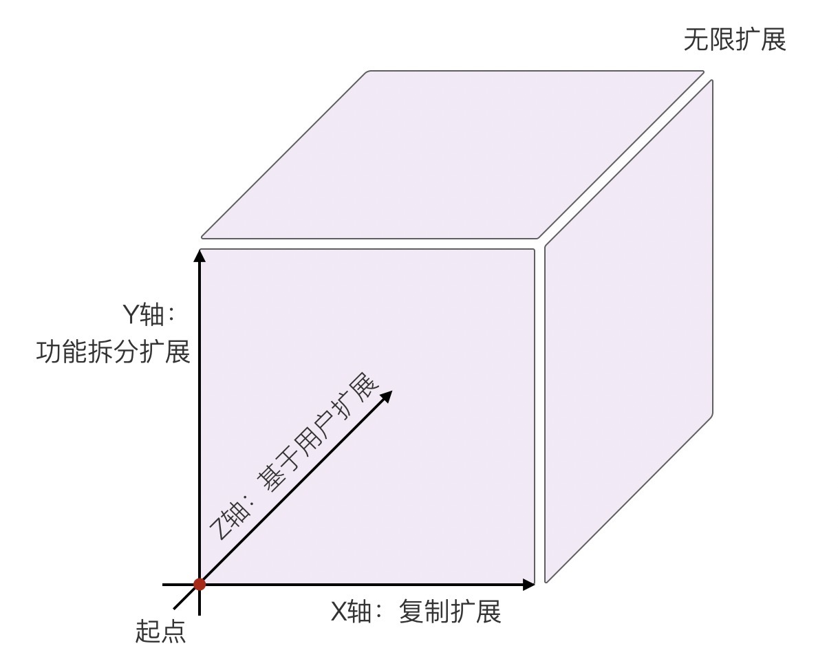 当然,X、Y、Z轴的扩展并不是孤立的,我们可以同时应用这3个维度扩展系统。分布式系统非常复杂,AKF给我们提供了一种自上而下的方法论,让我们能够针对不同场景下的性能瓶颈,以最低的成本提升性能。