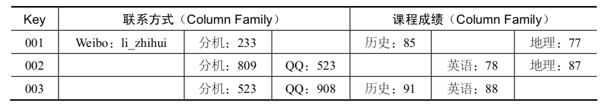 那有没有办法能够做到可扩展的数据结构设计呢?不用修改表结构就可以新增字段呢?当然有的,许多NoSQL数据库使用的列族(ColumnFamily)设计就是其中一个解决方案。列族最早在Google的BigTable中使用,这是一种面向列族的稀疏矩阵存储格式,如下图所示。