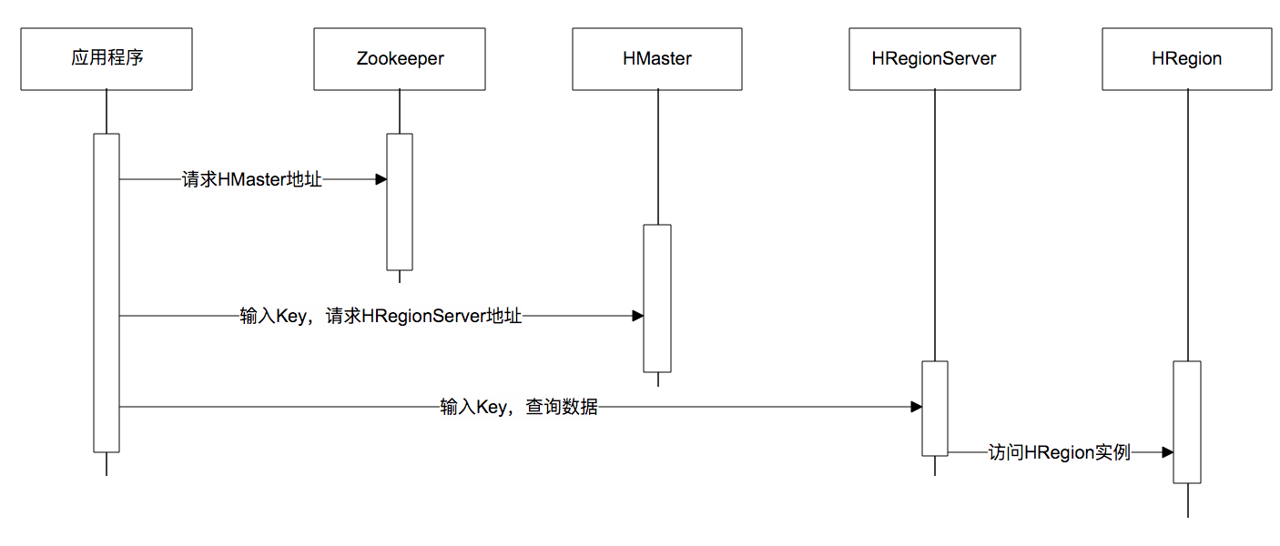 下面是一张调用时序图,应用程序通过ZooKeeper获得主HMaster的地址,输入Key值获得这个Key所在的HRegionServer地址,然后请求HRegionServer上的HRegion,获得所需要的数据。