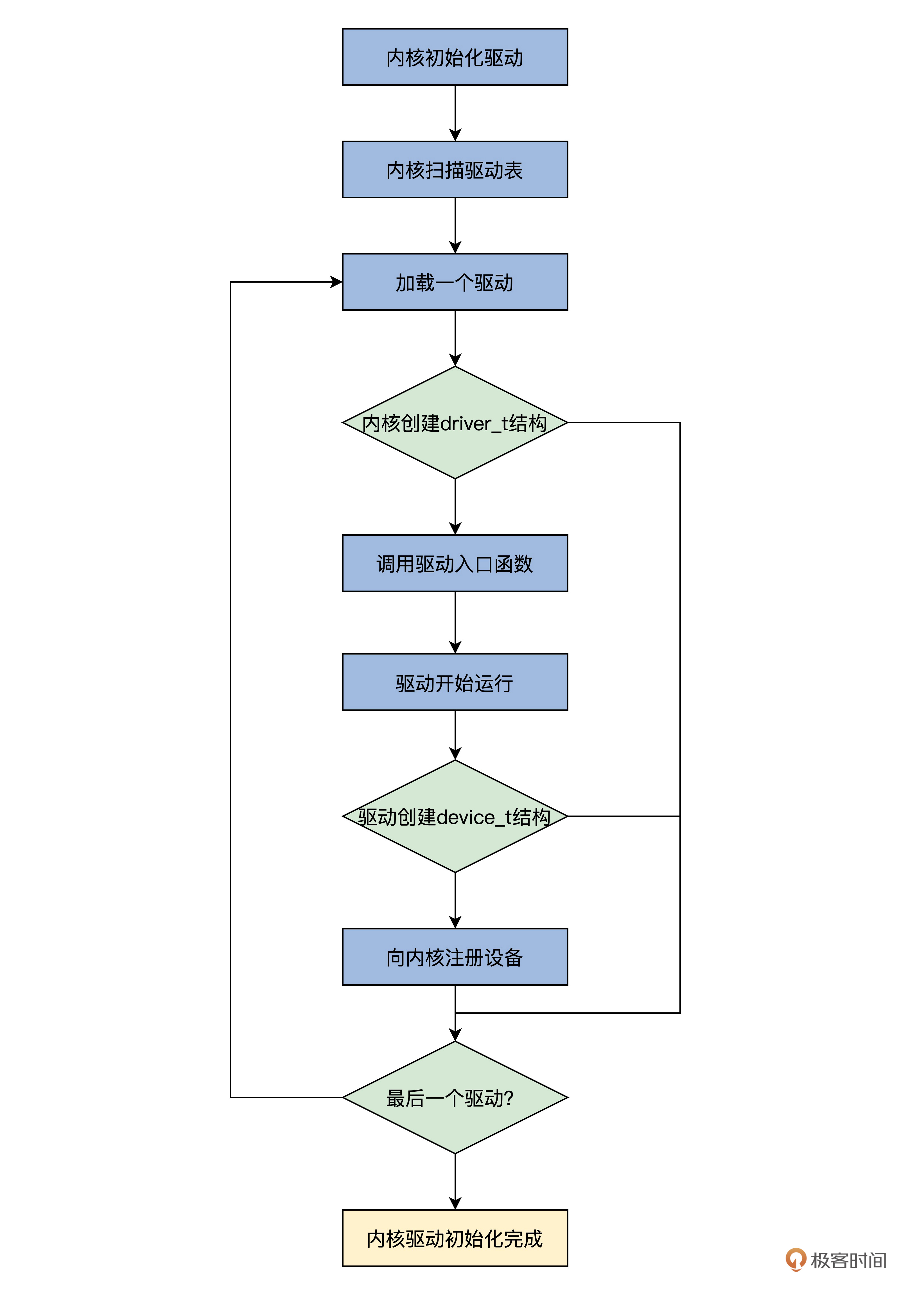 接下来,操作系统内核会根据返回状态,决定是否将该驱动程序加入到操作系统内核中。你可以这样理解,所谓将驱动程序加入到操作系统内核,无非就是将driver_t结构的实例变量挂载到设备表中。
