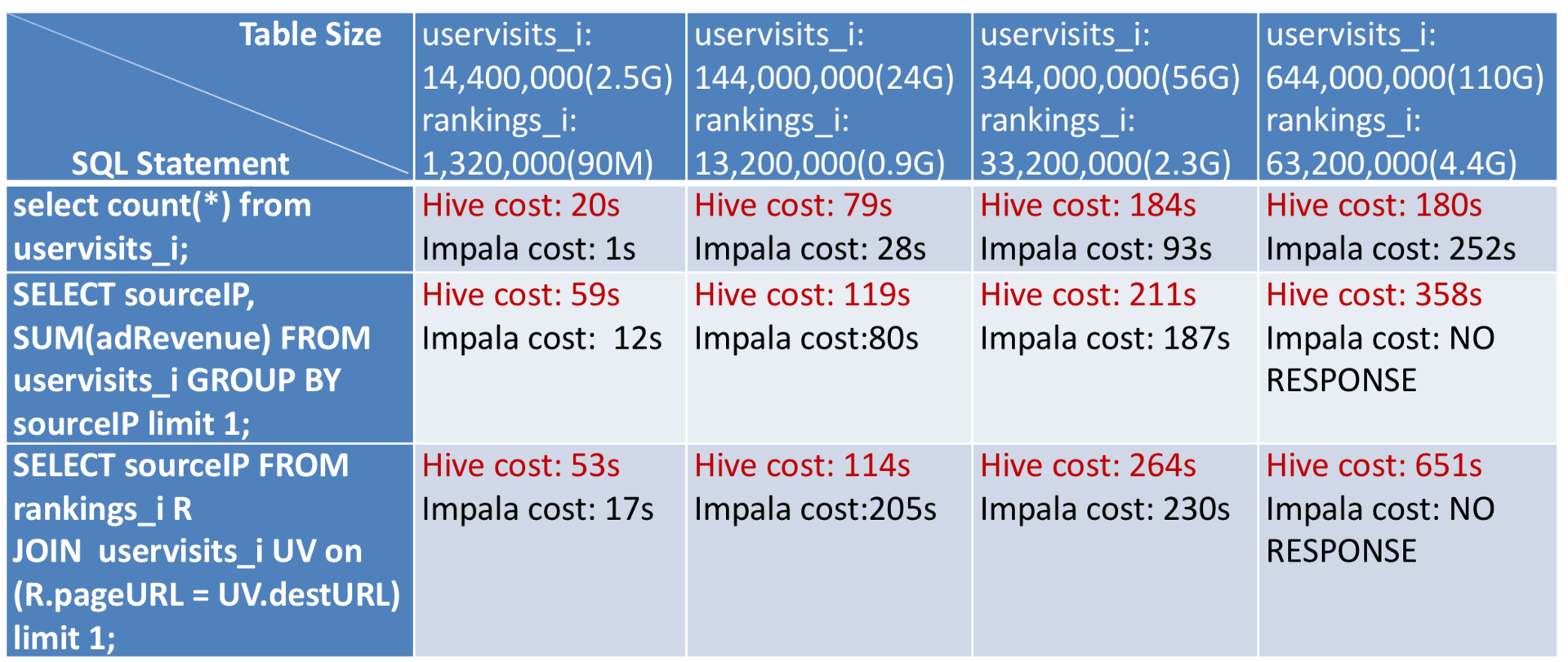 这样Impala就有点尴尬了,它的定位似乎只是Hive的附属品。这就好比Impala是餐前开胃菜和餐后甜点,而正餐依然是Hive。