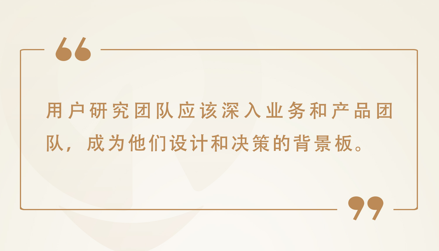 用户研究团队不应该等待别人提需求或者做自主研究,这样都背离了企业建立用户研究团队的初心。用户研究团队应该深入业务和产品团队,成为他们设计和决策的背景板。也就是说,不管是什么场景,用户研究都要结合业务和产品,成为他们做用户体验决策的有力的支持。