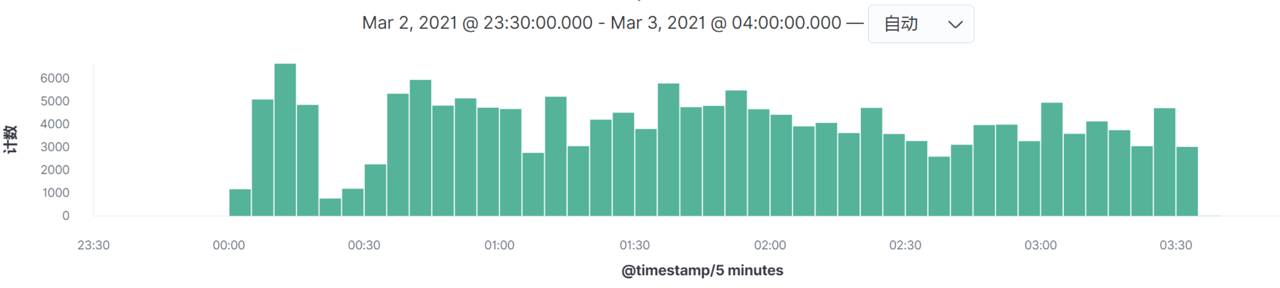 在查看ELFK中的数据时,建议你尽可能选择覆盖全部业务场景的时间段。比如说,我们要选择峰值时间段,一开始要选择时间段的范围设置大一些,这样才不会漏掉数据。然后再通过柱状图的高低做范围缩小。