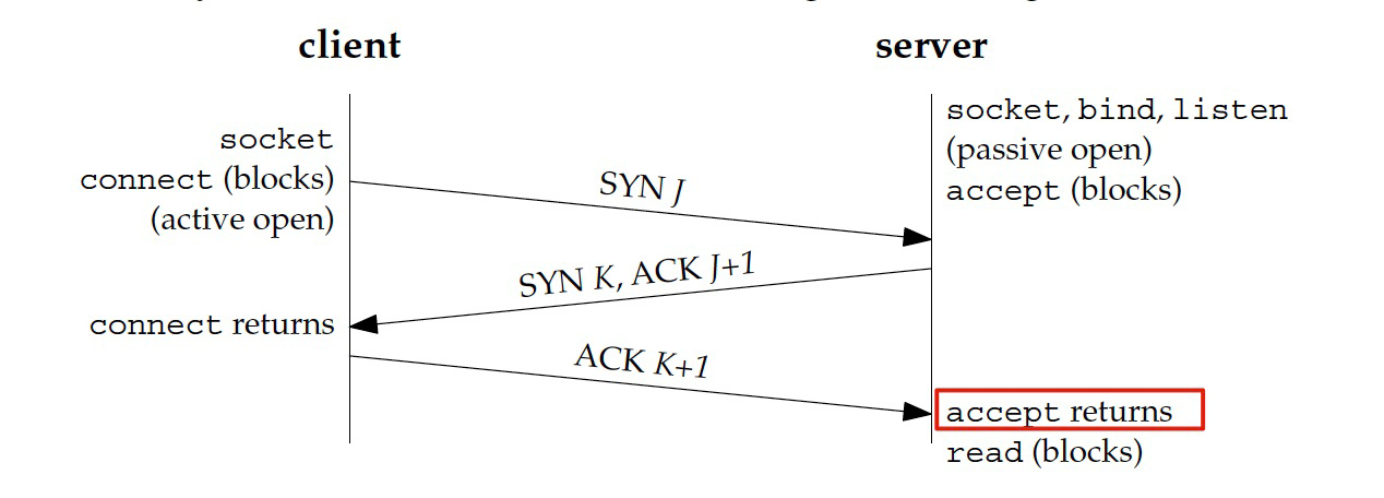 服务端的用户空间程序要使用TCP连接来接收请求,首先要获得上面最后一个接口,也就是**accept()**调用的返回。而accept()调用能成功返回的前提呢,是正常完成三次握手。