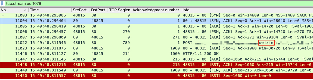 你只要往右拖动一下鼠标,就能看到POST URL里的“weixin”字符串了。而包号11448和11450这两个RST所在的TCP流的请求,也是带“weixin”字符串的,所以它们就是匹配上面这条日志的RST!