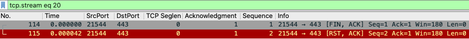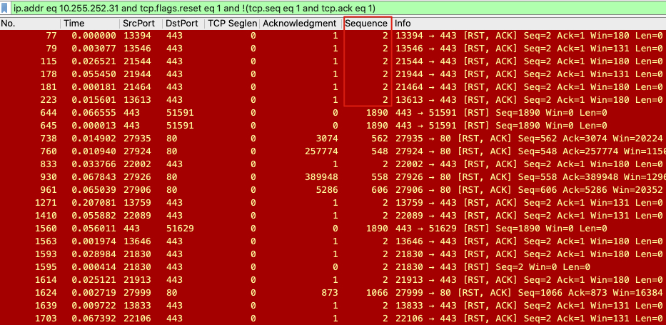 1 | frame.time >="dec 01, 2015 15:49:48" and frame.time <="dec 01, 2015 15:49:49" and ip.addr eq 10.255.252.31 and tcp.flags.reset eq 1 and !(tcp.seq eq 1 or tcp.ack eq 1) |