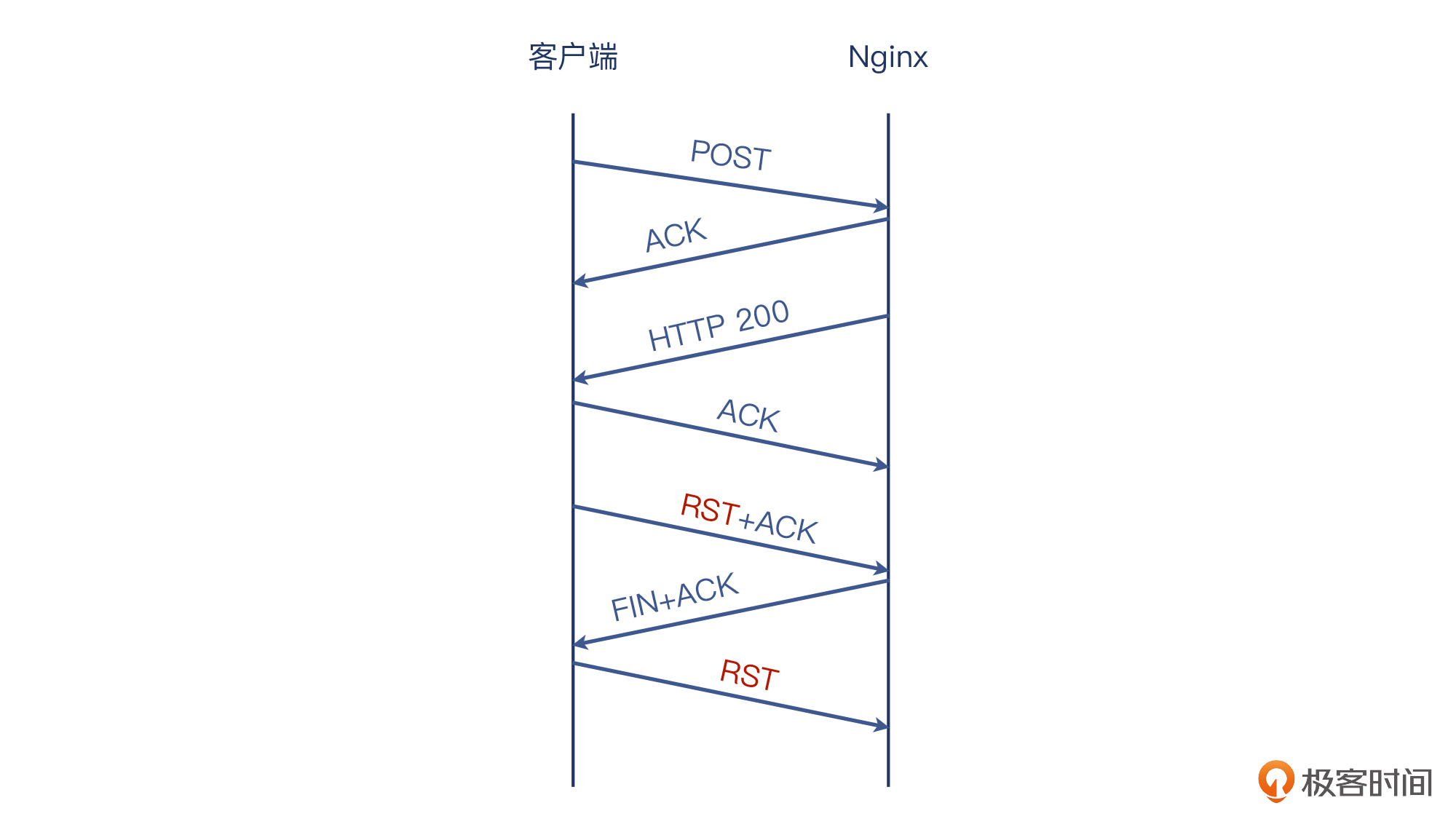 再进一步,我给你画一下这个HTTP事务的整体过程,帮你进一步搞清楚为什么这个RST,会引起Nginx记录connection reset by peer的报错: