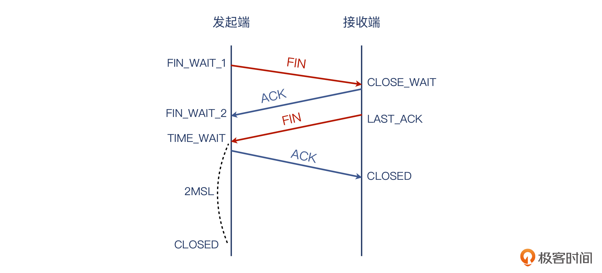 我在图上没有用“客户端”和“服务端”这种名称,而是叫“发起端”和“接收端”。这是因为,TCP的挥手是任意一端都可以主动发起的。也就是说,挥手的发起权并不固定给客户端或者服务端。这跟TCP握手不同:握手是客户端发起的。或者换个说法:发起握手的就是客户端。在握手阶段,角色分工十分明确。