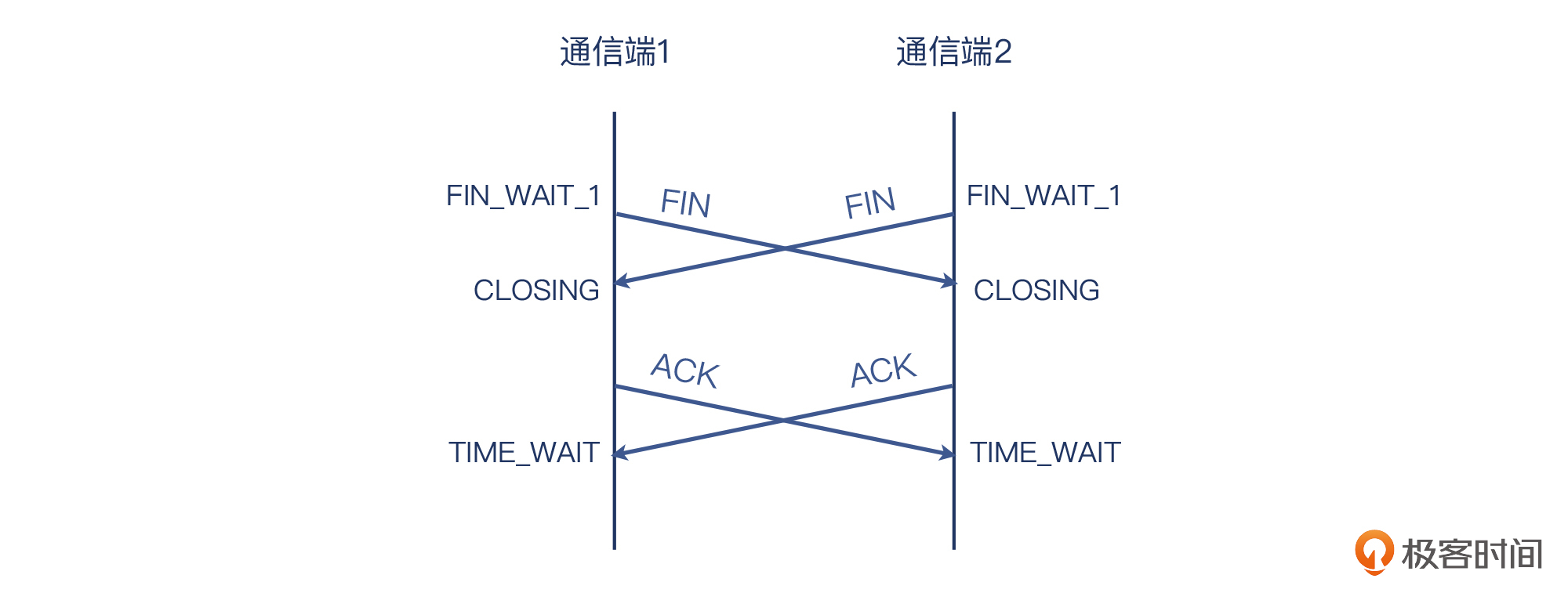 有的同学觉得挥手是客户端发起的,或者是服务端发起,反正就不能是双方同时发起。事实上,如果双方同时都主动发起了关闭,TCP会怎么处理这种情况呢?我们看下图: