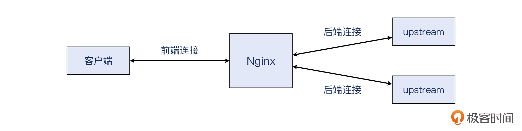 - upstream:在Nginx等反向代理软件的术语里,upstream是指后端的服务器。也就是说,客户端把请求发到Nginx,Nginx会把请求转发到upstream,等后者回复HTTP响应后,Nginx把这个响应回复给客户端。注意,这里的“客户端<->Nginx”和“Nginx<->upstream”是两条独立的TCP连接,也就是下图这样: