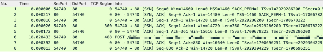 所以,上面的POST请求报文,其Information列就是POST方法加上具体的URL。它的TCP信息,包括序列号、确认号、标志位等,都需要到详情里面去找。