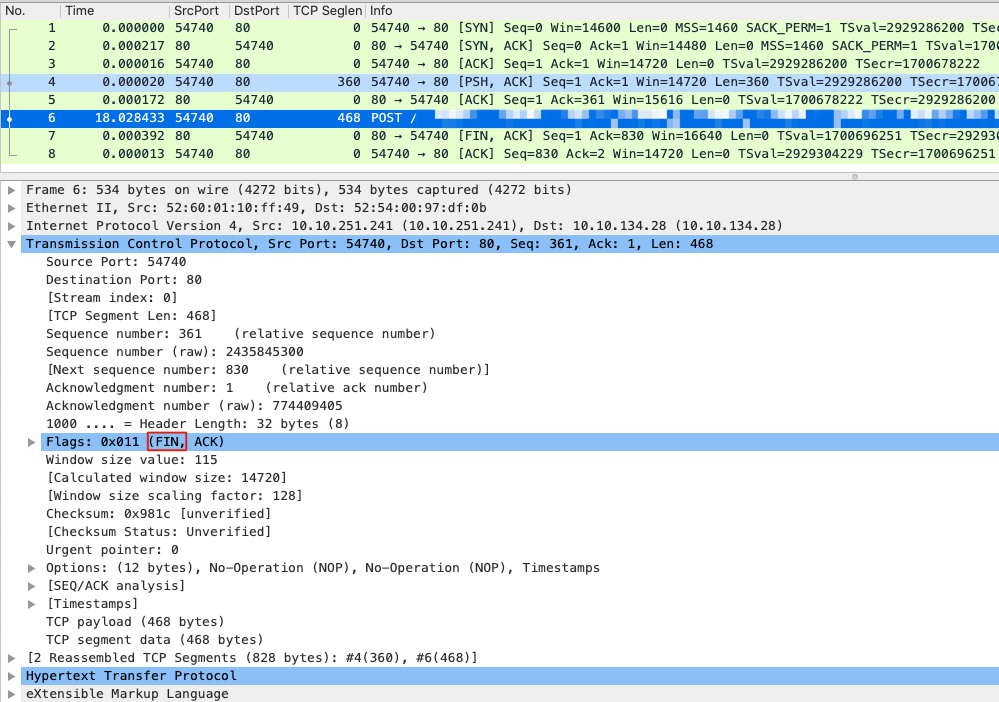 原来,第一个FIN控制报文,并没有像常规的那样单独出现,而是合并(Piggybacking)在POST报文里!所以,整个挥手过程,其实依然十分标准,完全遵循了协议规范。仅仅是因为Wireshark的显示问题,带来了一场小小的误会。虽然还有一个“为什么没有HTTP响应报文”的问题,但是TCP挥手方面的问题,已经得到了合理的解释了。