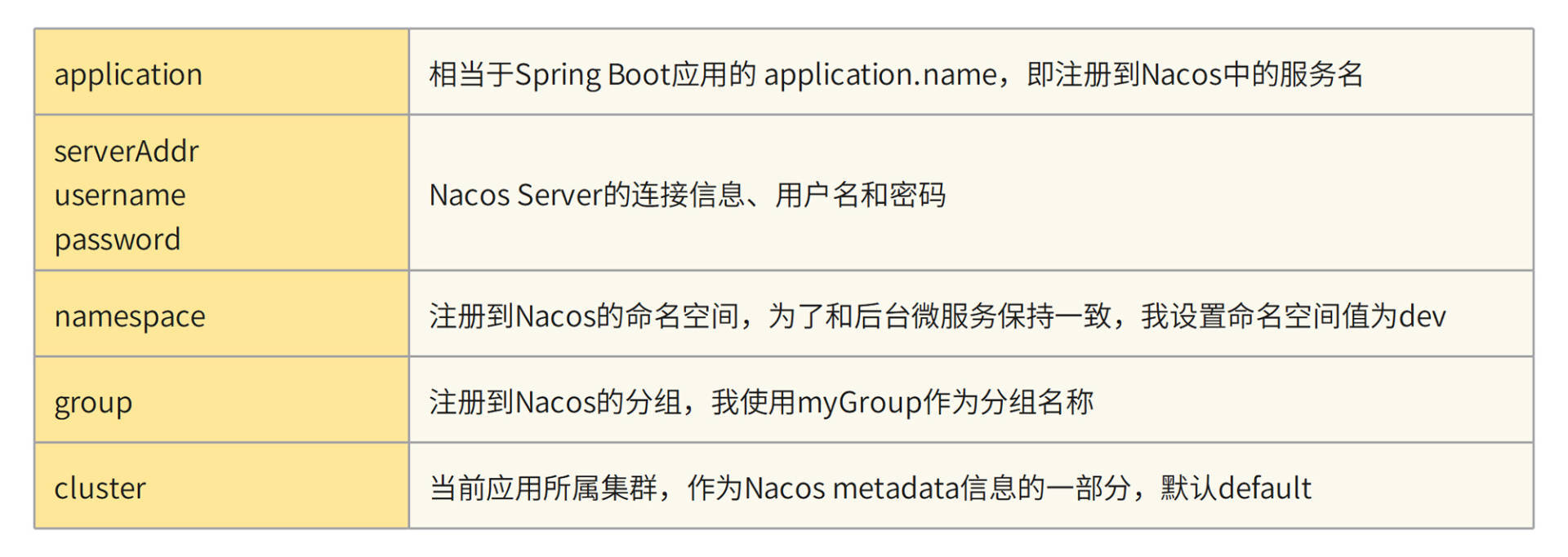 接下来,你还需要修改registry.nacos里的内容,我把主要的几个配置信息整理成了一个表格,你可以对照表格了解一下代码中配置项背后的含义。