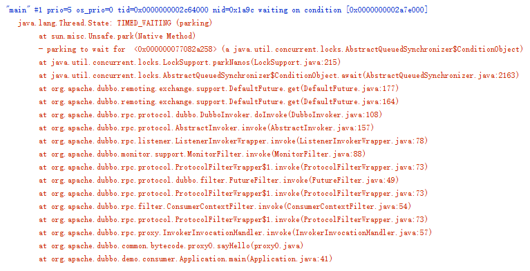 如果此时你将调用线程dump出来的话,会是下图这个样子,你会发现调用线程阻塞了,线程状态是TIMED_WAITING。本来发送请求是异步的,但是调用线程却阻塞了,说明Dubbo帮我们做了异步转同步的事情。通过调用栈,你能看到线程是阻塞在DefaultFuture.get()方法上,所以可以推断:Dubbo异步转同步的功能应该是通过DefaultFuture这个类实现的。