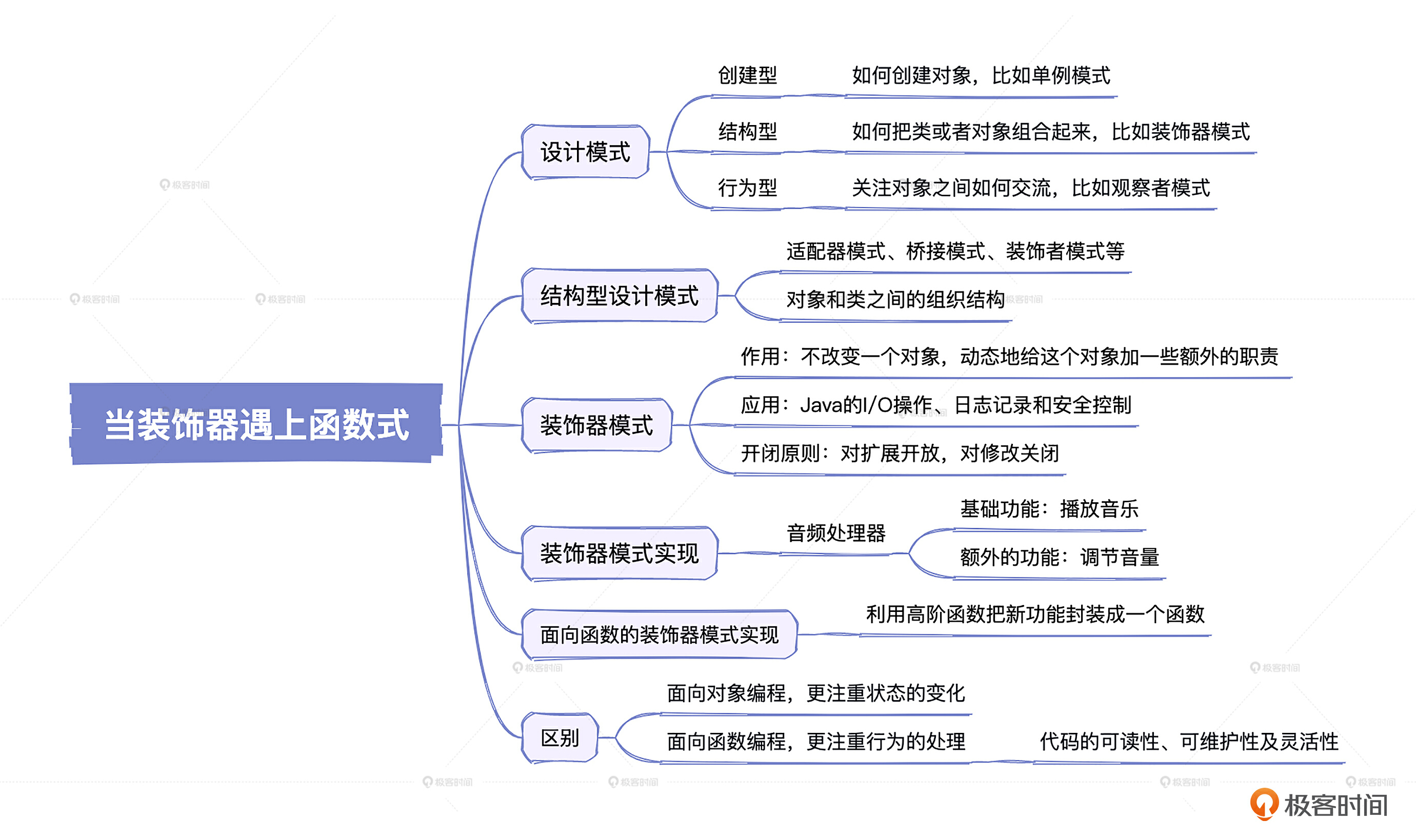 这种设计模式在Java的I/O操作、日志记录和安全控制等方面有很多应用。因为它可以在不修改原有类的代码的基础上,对一个对象进行包装扩展,使它有更强的功能,更能满足用户的多样化需要。所以它也实践了软件开发里的一条重要原则,就是开闭原则。也就是说,软件应该对扩展开放,对修改关闭。所以,如果你希望给现有的对象添加一些新功能,但又不想去修改既有的代码,那这个装饰器模式,就能帮你很好地解决这个问题。