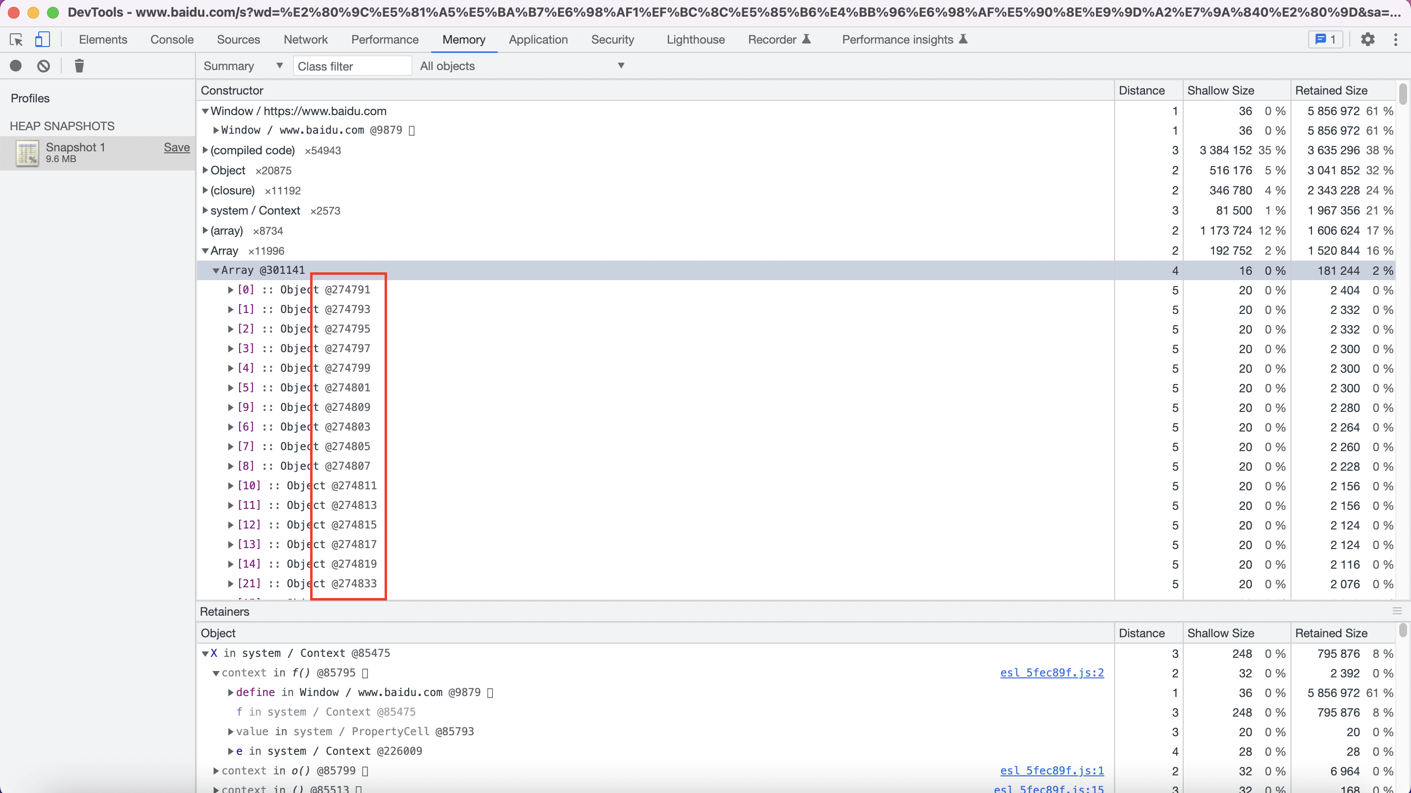 回到我们开篇的问题,在前端,最常见的字典就是我们使用的对象引用了。我们用的浏览器和JS引擎会在调用栈中引用对象,那么对象在堆中的实际位置如何寻找呢?这里,**对象在栈的引用和它在堆中的实际存储间的关联就是通过地址映射来实现的。这种映射关系就是通过字典来存储的。**我们可以用浏览器打开任何一个页面,然后打开开发者工具,在工具里,我们进入内存的标签页,然后选择获取一个堆的快照,之后我们便可以看到对象旁边的@后面的一串数字,这串数字就是对象在内存的地址。所以这里的字典就是一部地址簿。