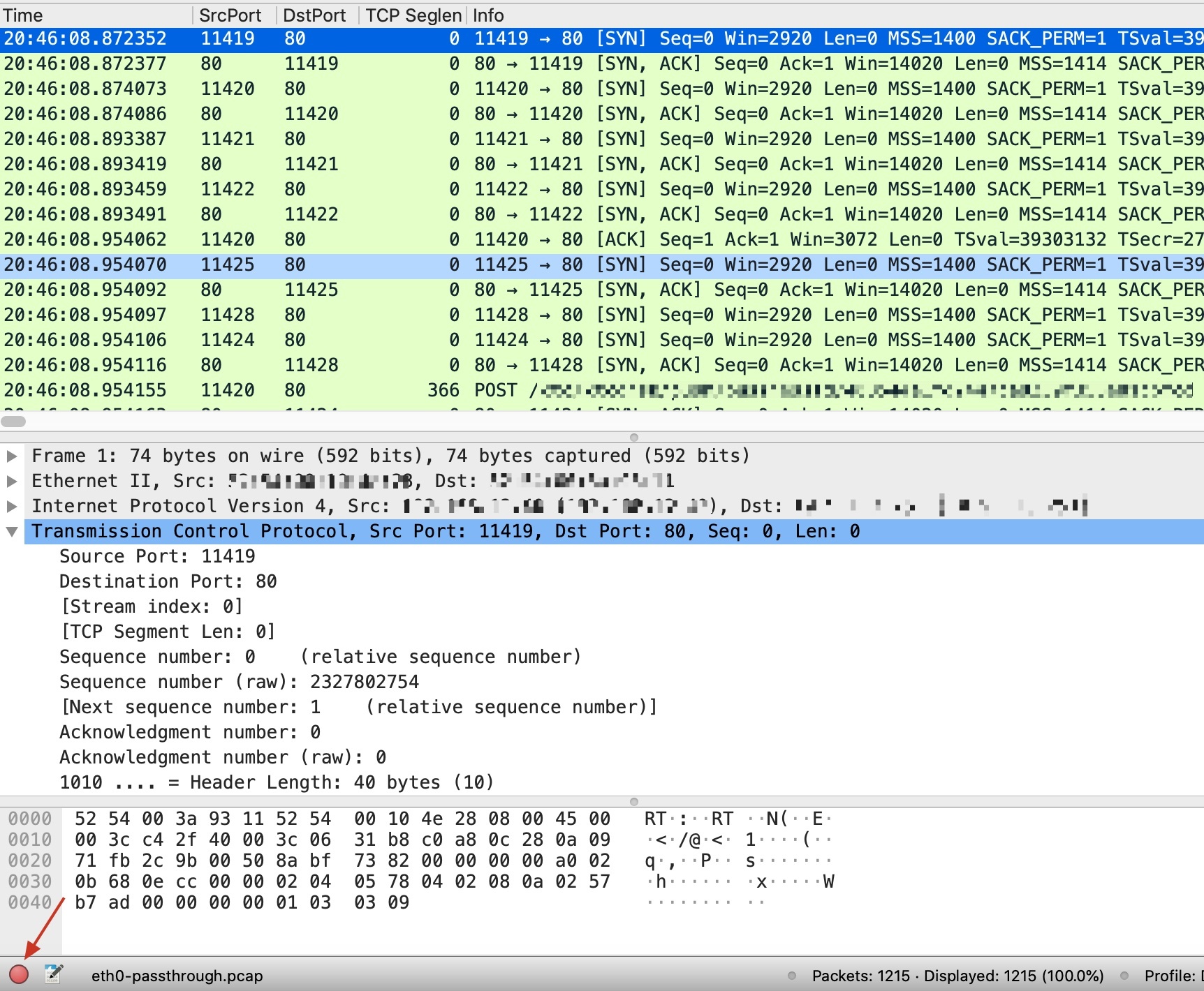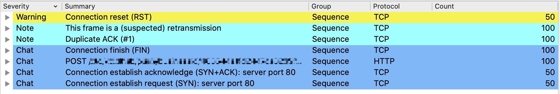 我们打开绕过LB的压测的抓包文件,在[第7讲]中,我提到过利用Expert Information(专家信息)来展开排查的小技巧。那么这里也是如此。