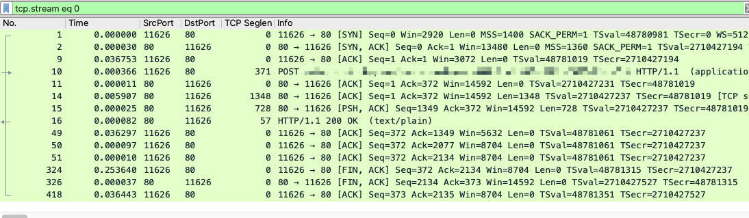 握手完成后,客户端就发送了POST请求,然后服务端先回复了一个ACK,确认收到了这个请求。之后有连续3个报文作为HTTP响应,返回给客户端。