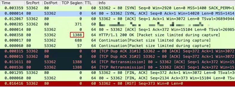 而且,因为MTU是一个静态设置,在同样的路径上,一旦某个尺寸的报文一次没通过,后续的这个尺寸的报文全都不能通过。这样的话,后续重传的两次1388字节的报文也都失败这个事实,也就可以解释了。