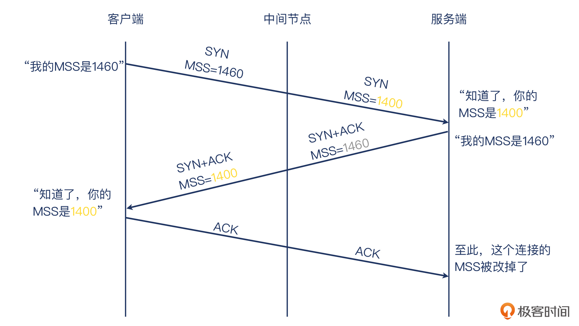 它工作起来就是下图这样,是不是很巧妙?通过这种途中的修改,两端就以修改后的MSS来工作了,这样就避免了用原先过大的MSS引发的问题。我称之为“暗箱操作”,就是因为这是通信双方都不知道的一个操作,而正是这个操作不动声色地解决了问题。