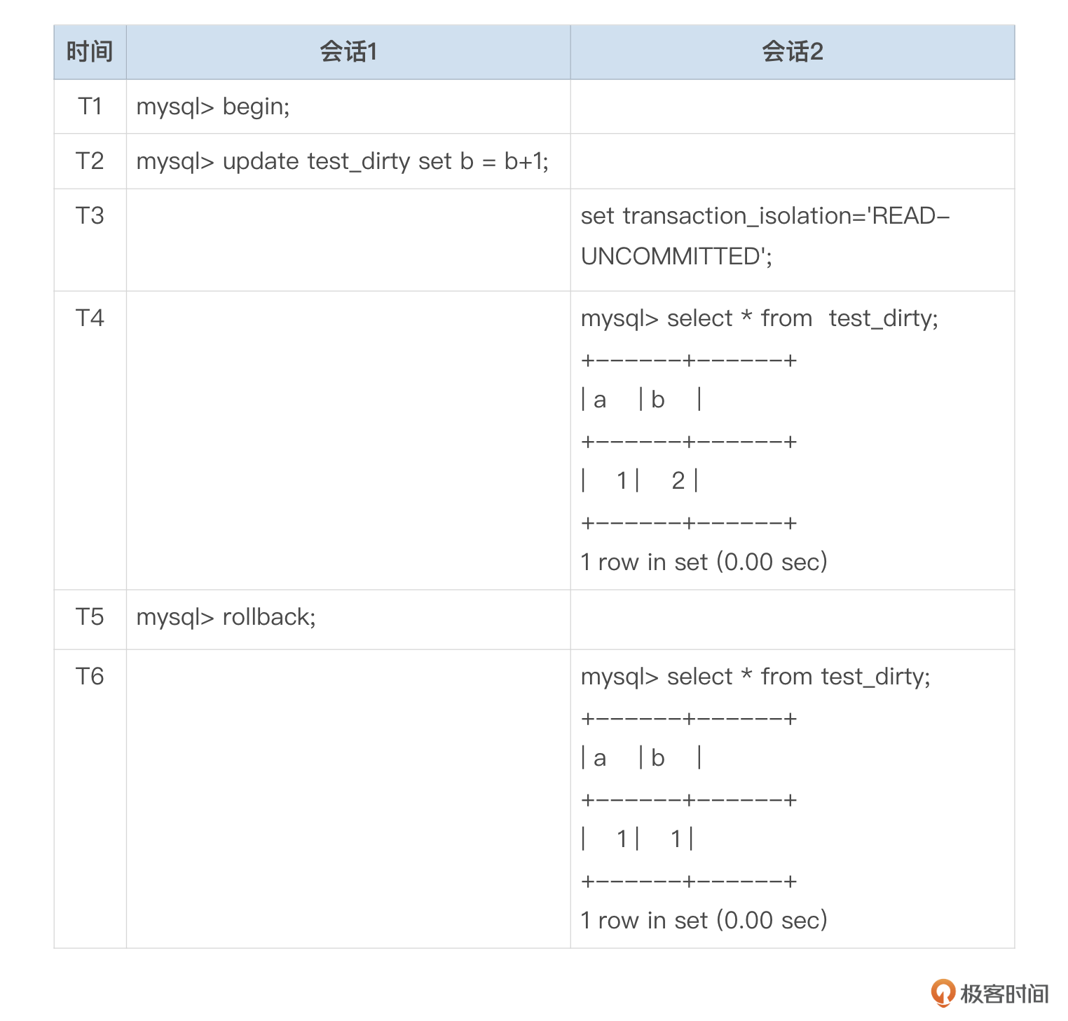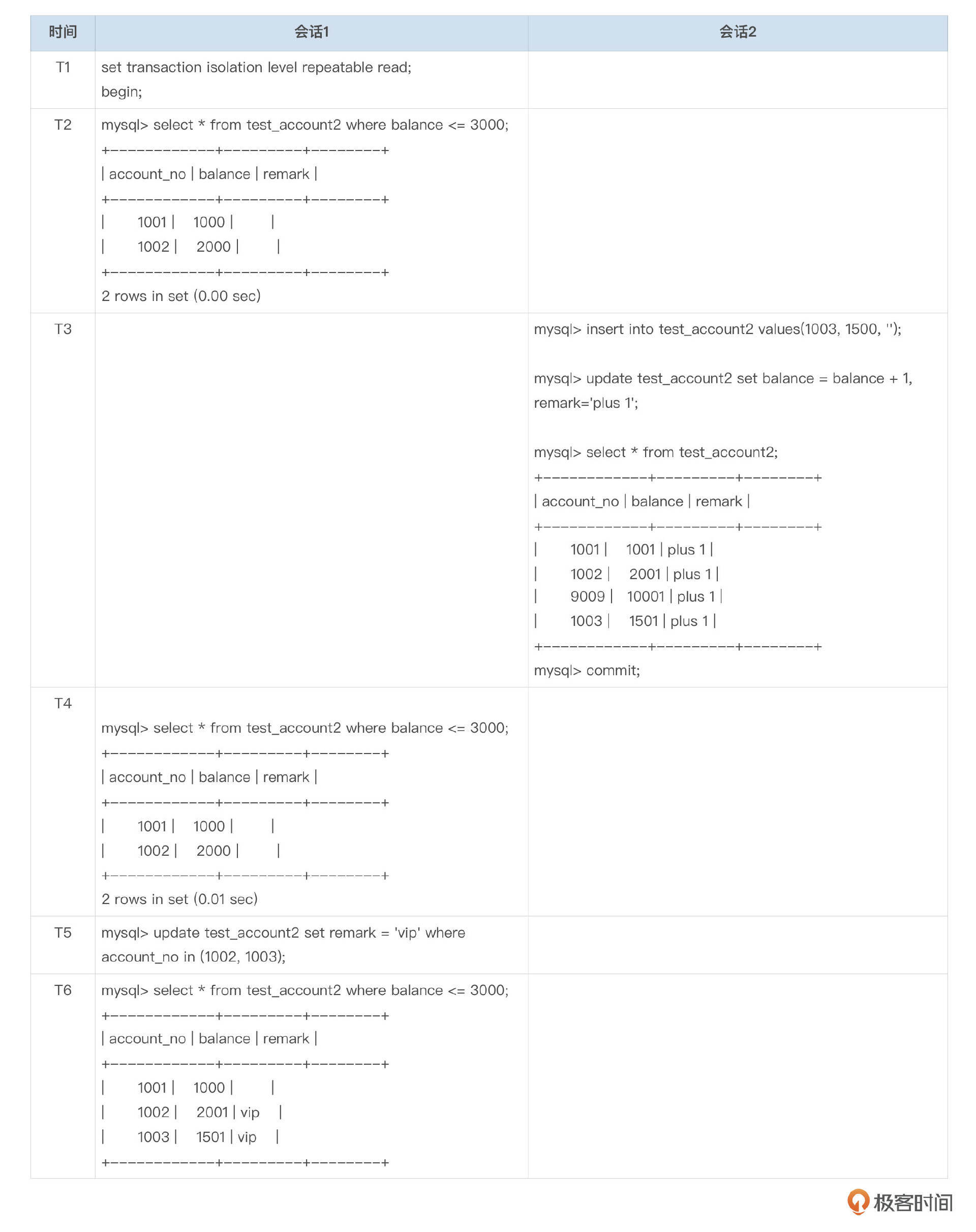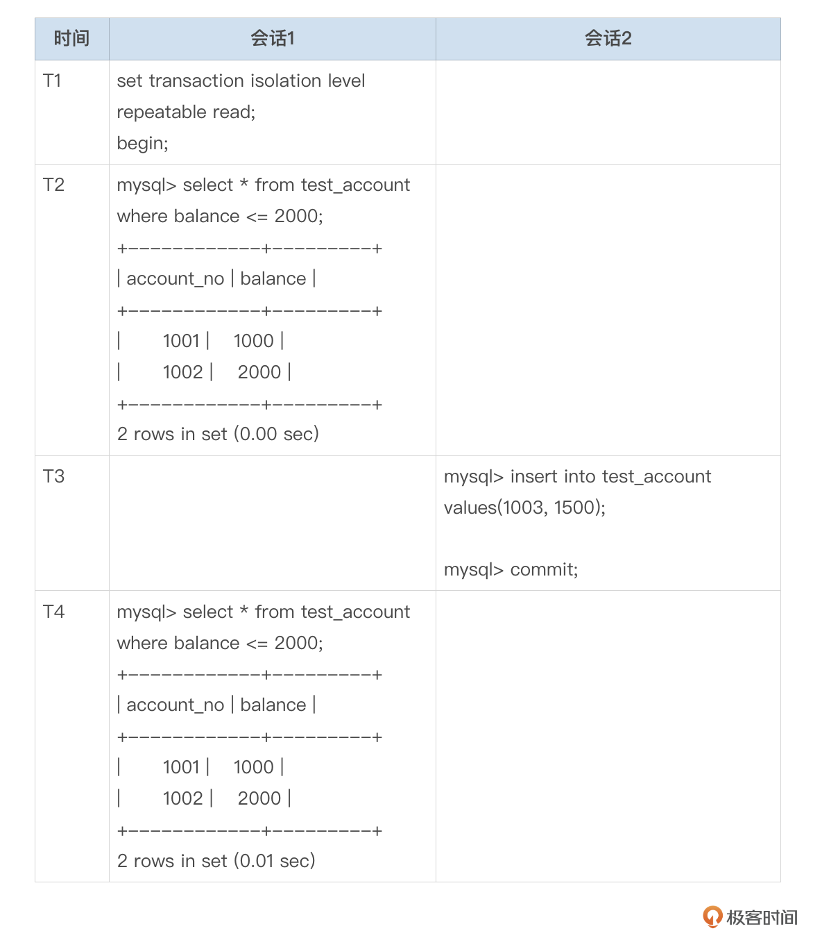 开启2个会话,按以下表格中的时间顺序依次执行SQL。