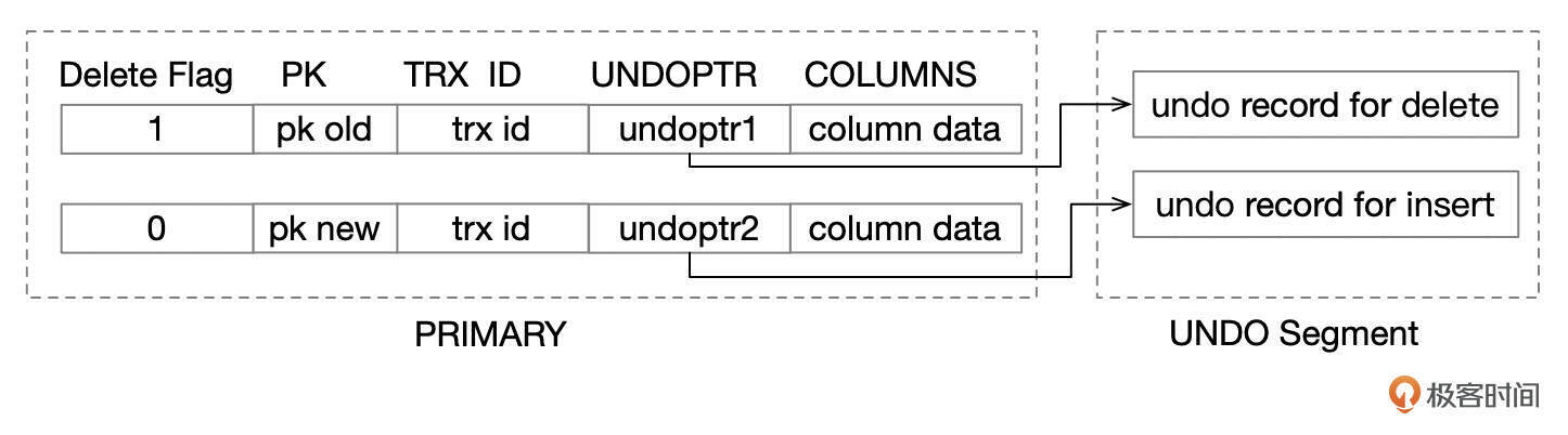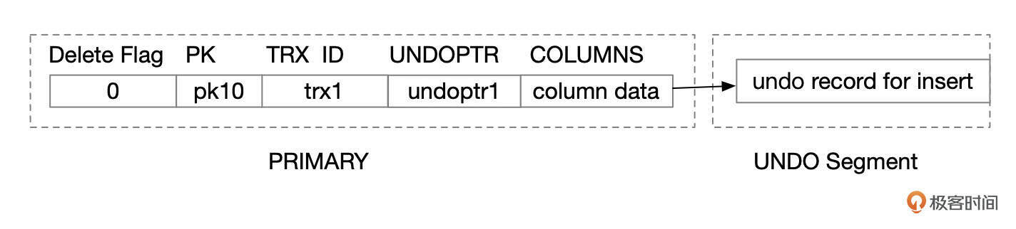 对于INSERT操作,UNDO PTR有一个特殊的标识为,标记当前的操作为INSERT。