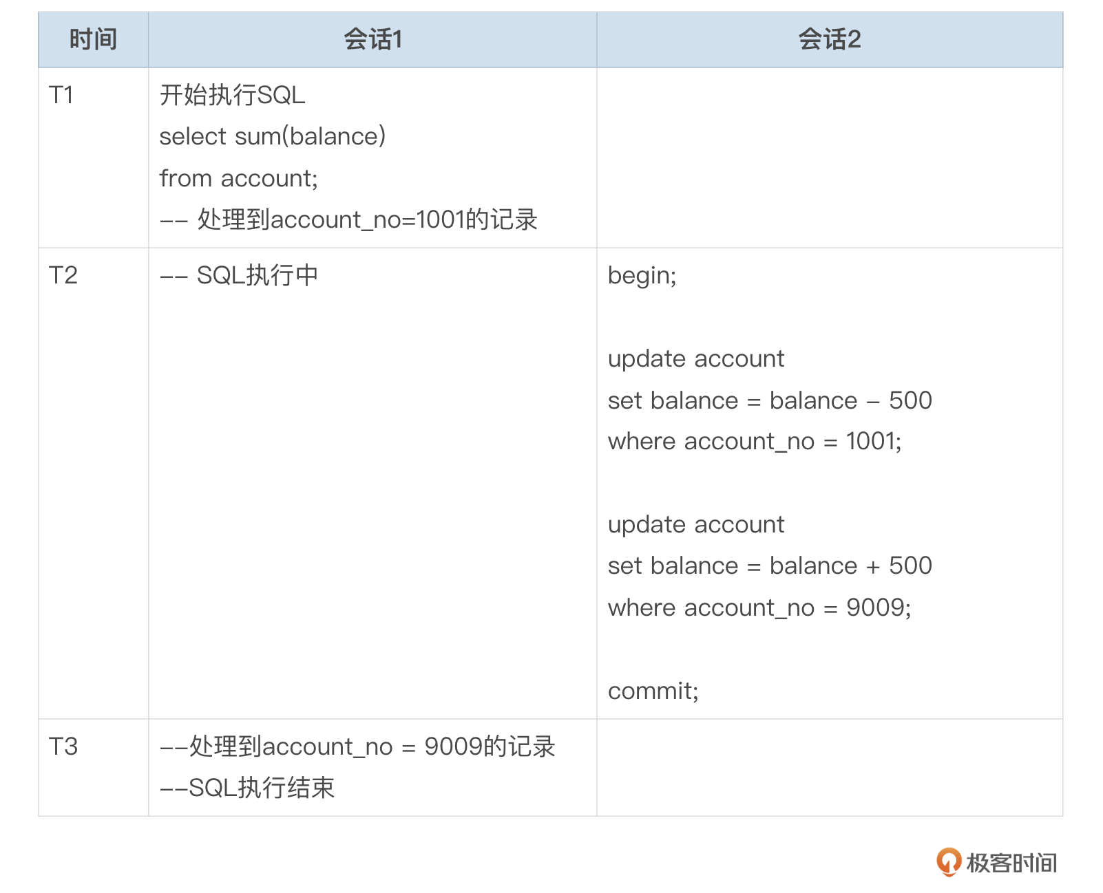 上述假想的例子中,会话1开始执行统计SQL,由于表比较大,该SQL需要执行一段时间,在这个SQL执行期间,会话2发起一个转账事务,将部分金额从account_no为1001的记录转到account_no为9009的记录并提交。会话1中的SQL,在T1时刻读取到account_no为1001的记录的余额,其中有500转到了T3时刻读取到的account_no为9009的记录中,那么在READ COMMITTED隔离级别下,该SQL是否存在数据不一致的情况(金额被重复计算)?