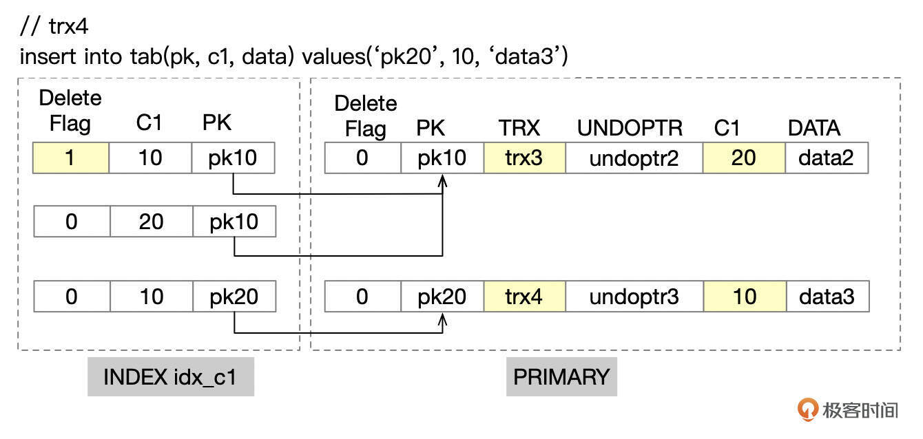 更新之后,索引idx_c1中的记录(10, pk10)被标记为已删除,同时插入新的索引记录(20, pk10)。主键记录中,db_trx_id字段更新为trx3,db_roll_ptr指向UPDATE操作产生的undo记录,C1字段更新为20。