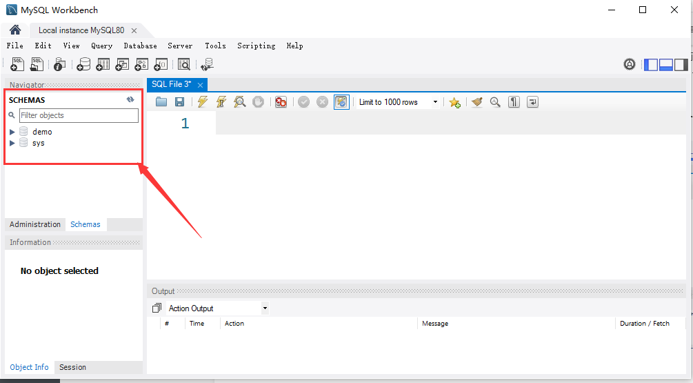 看到这儿,你是不是觉得很奇怪,为什么Workbench导航栏里面的数据库只有两个(我们创建的数据库“demo”和安装完MySQL就有的数据库“sys”)呢?