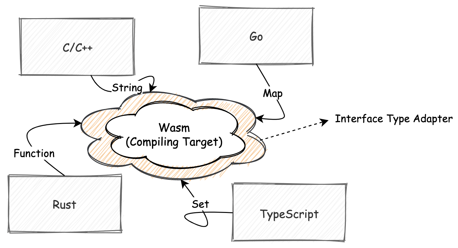 我们知道在目前的 Wasm MVP 标准中,Wasm 与宿主环境(比如 JavaScript)之间只能够互相传递“数字值”类型的数据。而对于诸如“字符串”、“对象”等复杂、特殊的数据类型,则需要通过编解码的方式来在两个不同环境之间传递和使用。这无疑增加了应用的整体执行成本和开发者的负担。而 “Interface Type” 提案的出现便可以在一定程度上解决这个问题。