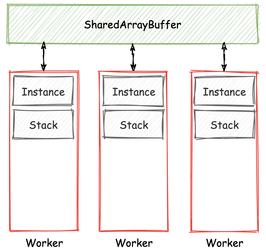 多线程模式的一个特征就是,每个 Worker 线程都将会实例化自己独有的 Wasm 对象,并且每个 Wasm 对象也都将拥有自己独立的栈容器用来存储操作数据。