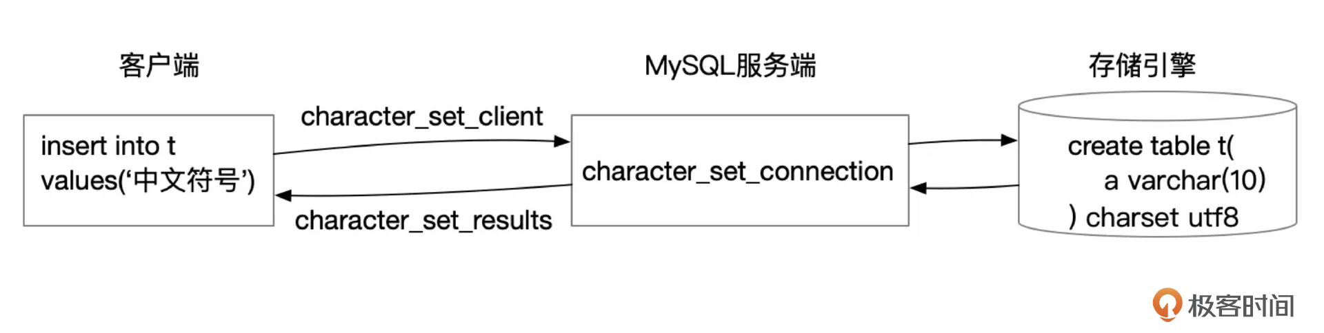 容易发生乱码问题。 表连接时可能会发生隐式类型转换,导致查询无法用到一些索引,从而影响查询的性能。关于这一点,后续的课程中还会有具体的例子,这里不再展开。 下面我们借助这个图,对文本数据在客户端、MySQL服务端、存储引擎之间的传输和处理时如何编码和解码做一个小结。