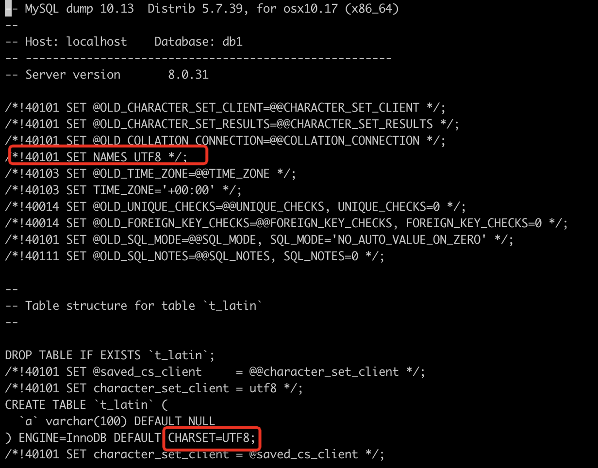 1 2 3 4 $ mysqldump --default -character-set utf8mb4 -uroot db_emoji > db_emoji_utf8mb4.sql $ grep 'INSERT INTO' db_emoji_utf8mb4.sql INSERT INTO `t_emoji` VALUES ('row1:😀😀😀' ),('row2:no emoji chars' );