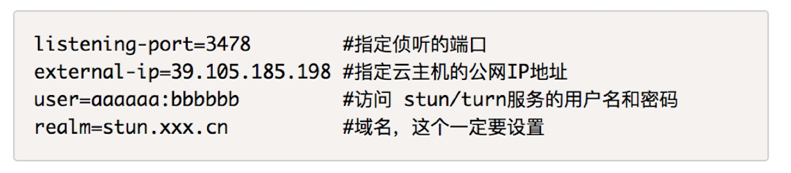 接下来是布署,coturn 的配置文件中有很多选项,不过这些选项大部分都可以不用,或采用默认值,因此我们只需要修改4项内容就可以将coturn 服务配置好了,这4项配置如下: