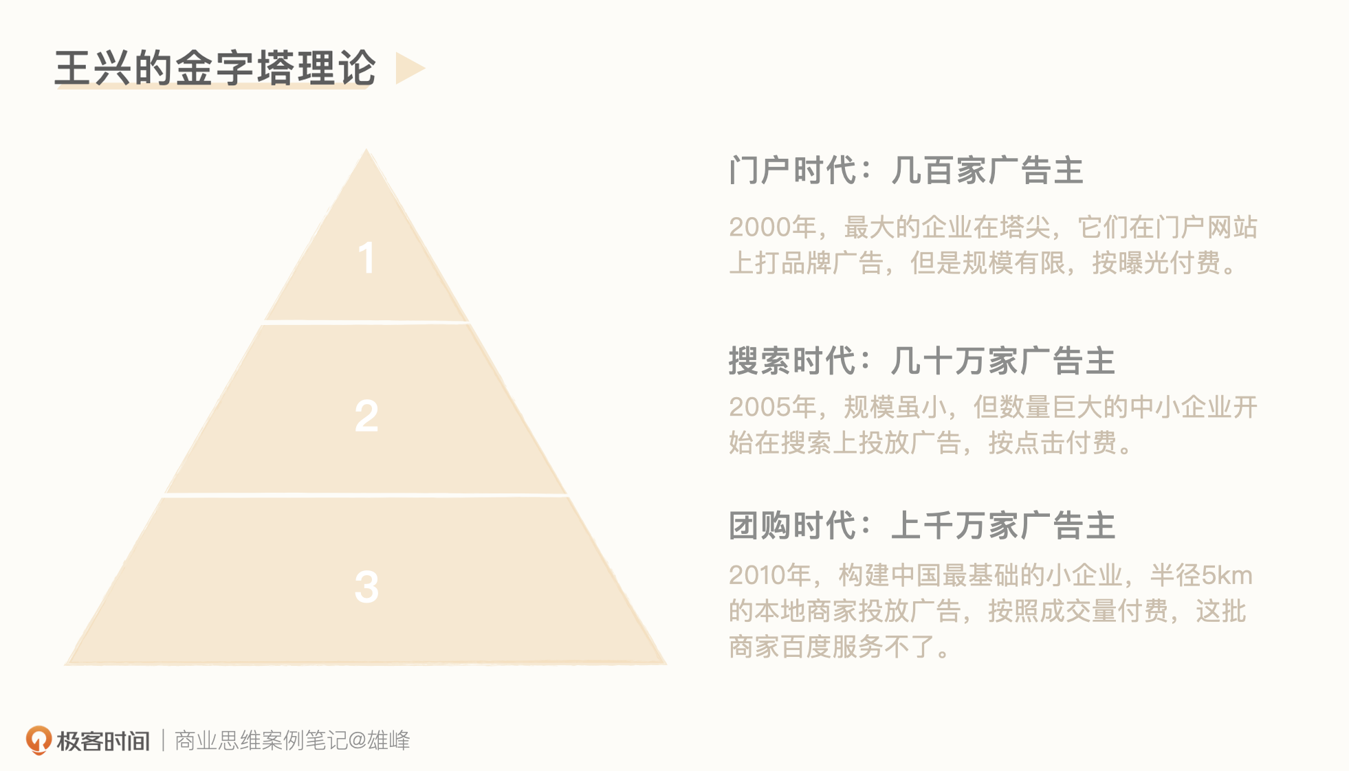 按照王兴的理论逻辑,搜索时代只能够服务线上的广告主,但是团购时代可以服务线下半径5km的本地商家,将广告主服务从几十万拓展到上千万,从而成就最完美的商业模式。