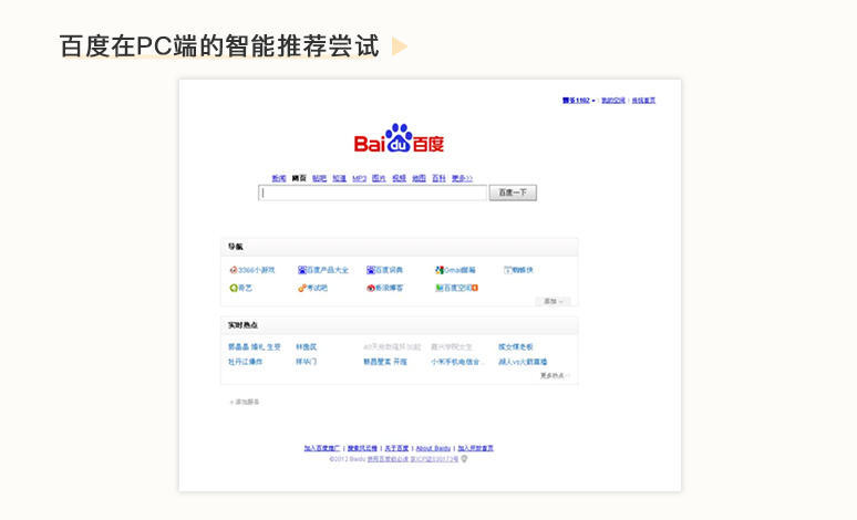 此前,百度并非没有看到个性化推荐和信息流广告的机会。早在今日头条成立之前,百度就曾在PC上尝试过智能推荐。在2011年的百度世界大会上,百度公布了新首页,在固有的搜索框之下,增添了网站导航、实时热点,新鲜事等版块,打造“一人一百度”的口号。